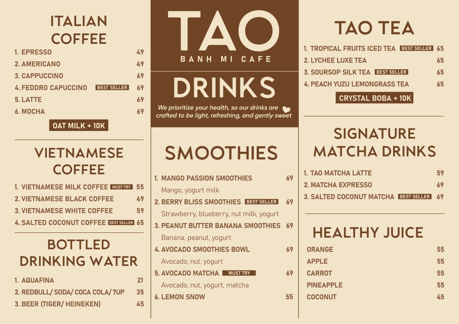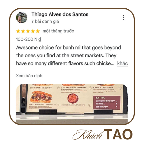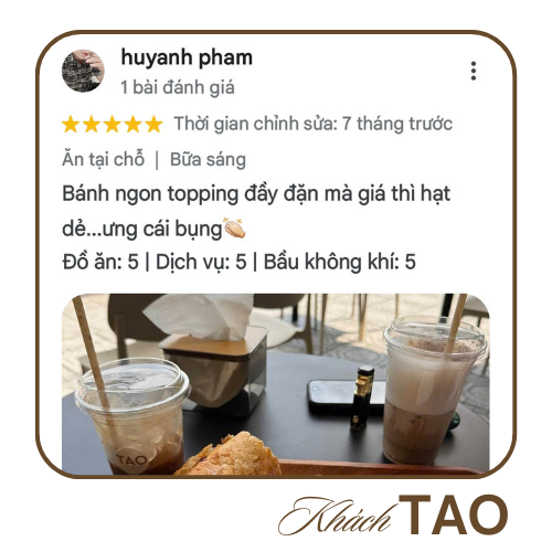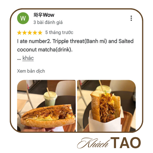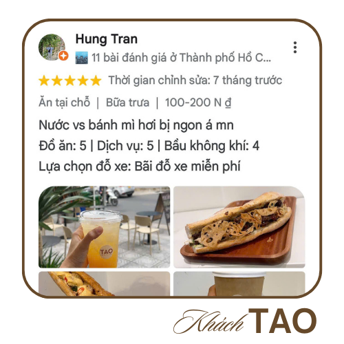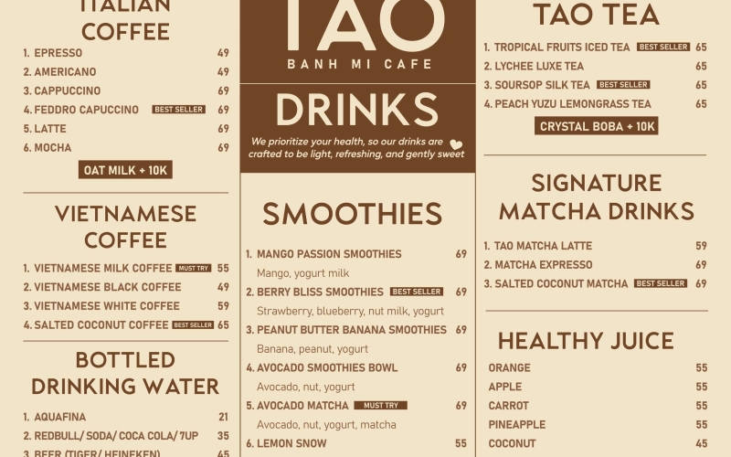 TAO Banhmi Cafe ra đời từ niềm đam mê bất tận với ẩm thực Việt Nam và khát vọng tạo nên một trải nghiệm khác biệt. Lấy cảm hứng từ thói quen quen thuộc của người Việt – “ăn bánh mì, uống cà phê” – chúng tôi không ngừng sáng tạo để mang đến những chiếc bánh mì đậm đà bản sắc, kết hợp cùng phong vị hiện đại đầy táo bạo.